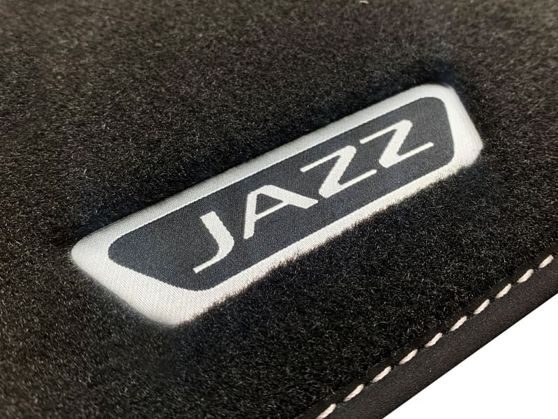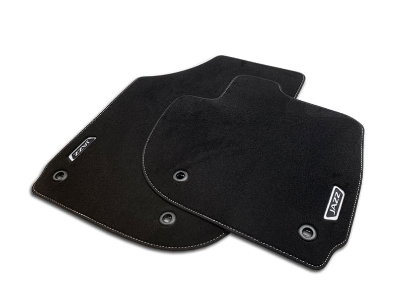 Black/Silver – These elegant and comfortable fitted tufted carpets, with black nubuck binding, have a woven Jazz emblem for durability. One set includes: front and rear mats. RIGHT HAND DRIVE.