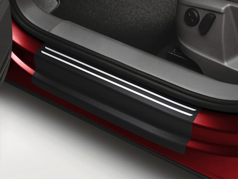 An eye-catcher when you get in: the black film with silver decorative not only improves the appearance of your car´s door sills, it also protects against scratches. The precisely-cut sill protector film simply sticks in place. Each set comprises four film pieces for the front and rear door sills. 1 set = 4