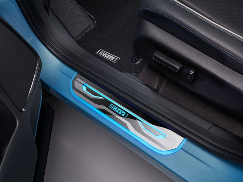 The illuminated doorstep garnishes are crafted with a chrome finish and have a blue illuminated e:Ny1 logo. They help to protect the door sills from marks and scratches. The kit includes illuminated front and non-illuminated rear garnishes.