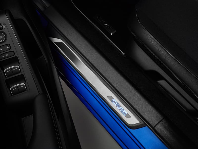 The illuminated doorstep garnishes are crafted in brushed stainless steel and have a white illuminated Civic e:HEV logo.