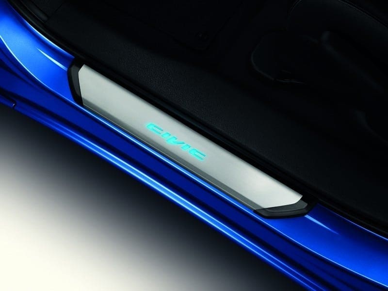 Crafted in stainless steel with a brushed finish and a black surrounding garnish, the front Doorstep Garnishes feature a blue illuminated Civic logo.