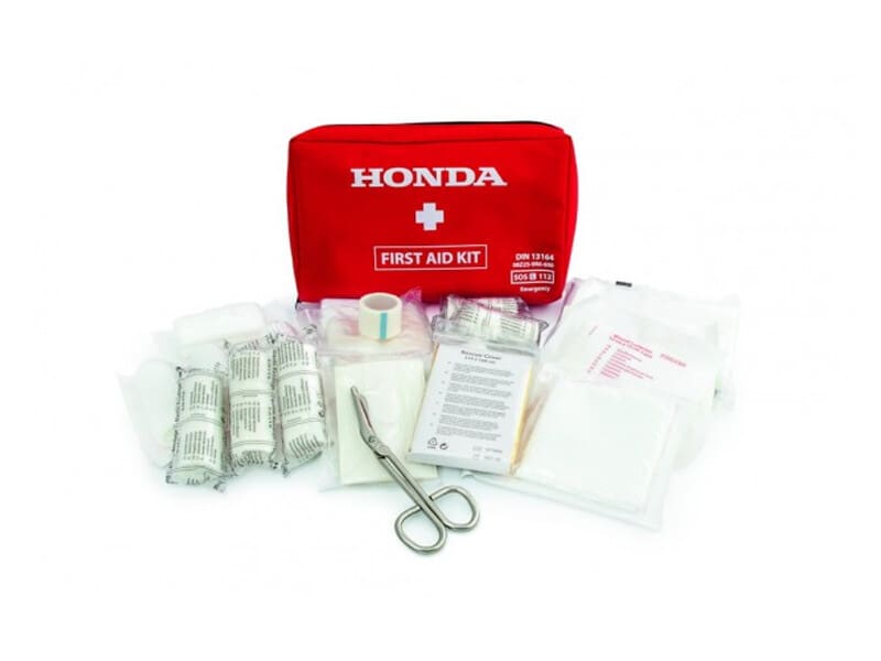 Includes: bandages, adhesive bandages, dressing, scissors, gloves, first aid instructions & Honda-branded pouch.
