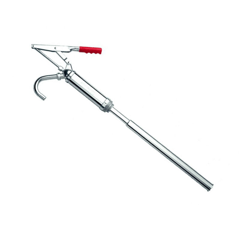 Hand pump with adjustable telescopic tube for barrels of 60 and 208 litres suitable. Oil, fuel, various chemicals, additives and other non-corrosive liquids can be pumped. The pump is equipped with an adapter for a hose nozzle and a comfortable vinyl handle. Its zinc and chrome coating guarantees a long durability and a beautiful finish. Suitable for 47-90 cm high drums.