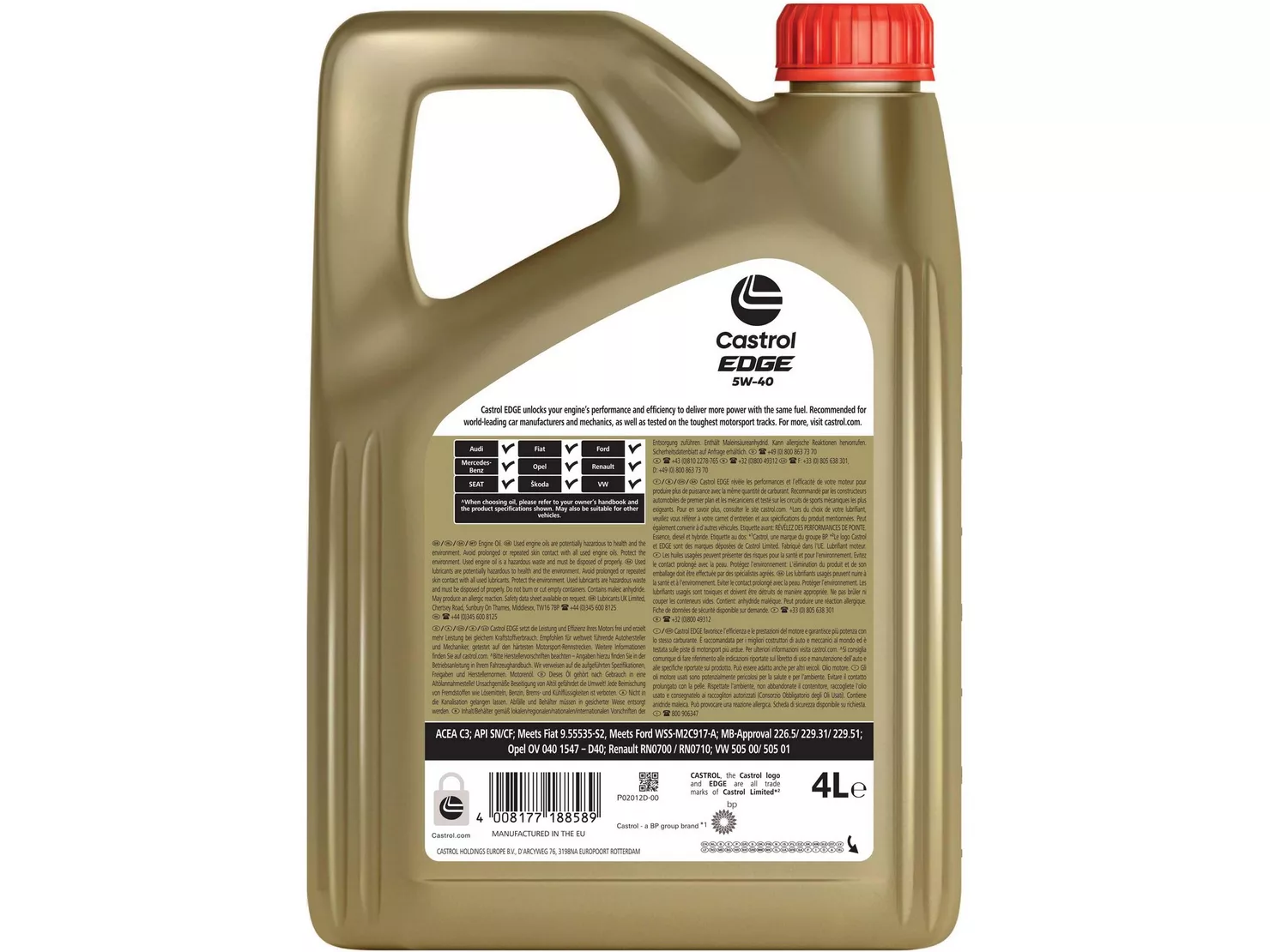 Castrol EDGE 5W-40, boosted with TITANIUM FST™ (Fluid Strength Technology), delivers up to twice the oil film strength to prevent breakdown, reduce friction, and sustain maximum performance. Independently tested and approved by leading car manufacturers, this is Castrol’s strongest and most advanced fully synthetic oil – engineered for drivers who demand the very best.
