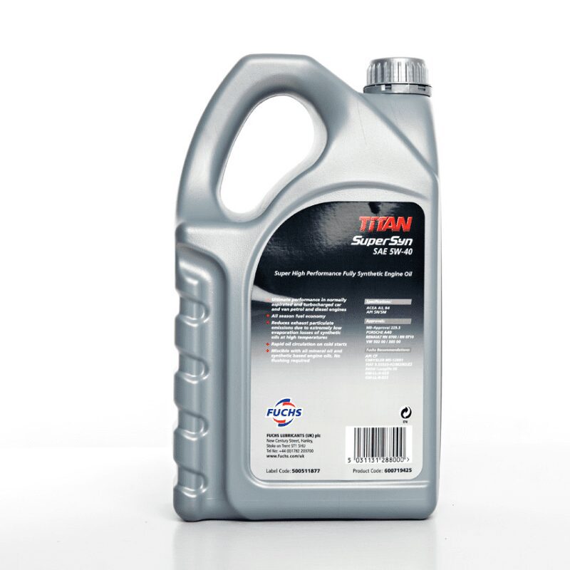 Fuchs TITAN SUPERSYN 5W-40 is an ultra high performance, fuel-economy engine oil suitable for a variety of vehicles, with or without extended service intervals. It offers excellent cold start performance and reduced oil consumption, ensuring rapid lubrication throughout the engine for maximum protection and durability.