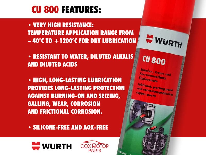Wurth CU 800 is a high-performance, copper-based lubricating and anti-seize spray designed for extreme conditions. Whether you’re servicing brakes, battery terminals, or high-heat screw joints, CU 800 ensures lasting lubrication and corrosion resistance.