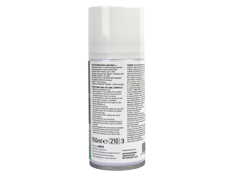 Forté Interior Virus Sanitiser / Aircon Cleaner 150ml is a disinfectant product in a total discharge aerosol, specifically designed to easily disinfect and deodorise vehicle interiors (up to 4m2)