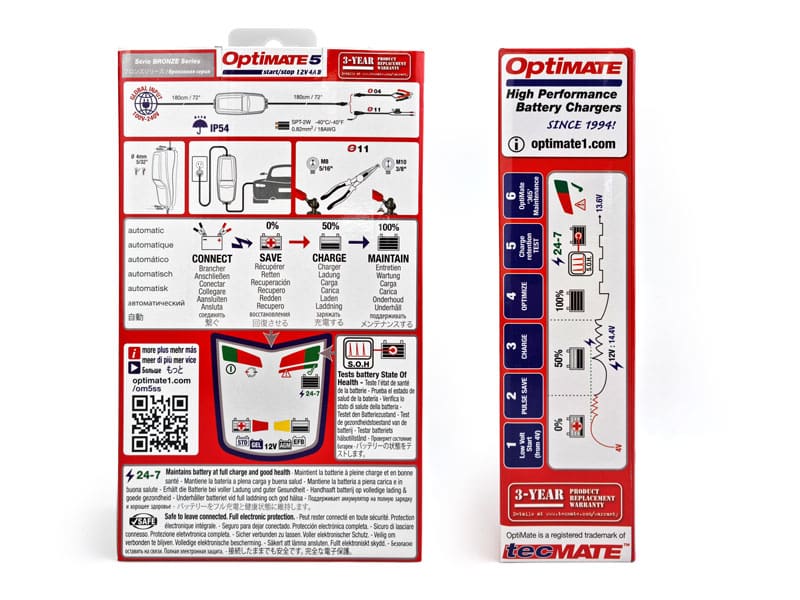 OptiMate 5 is your all-in-one battery charging, recovery and maintenance tool. Whether your battery has been neglected over winter or simply needs regular care, OptiMate 5 intelligently revives and maintains it, prolonging battery life by up to 400%.