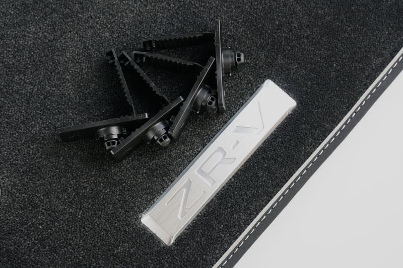 Black/silver – These premium and comfortable fitted tufted carpets, with a dual tone black/silver binding, have a metal ZR-V emblem for durability. One set includes: front and rear mats.