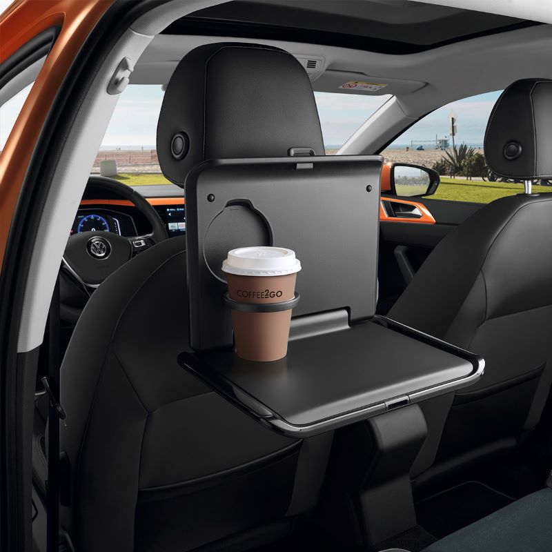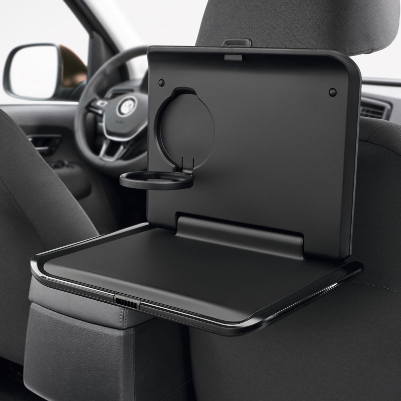The Genuine Volkswagen Folding Table is a versatile accessory designed to integrate seamlessly with the Volkswagen Travel & Comfort system. It attaches securely to the base carrier using a simple click-in mechanism, keeping everything stable and within easy reach for rear-seat passengers.