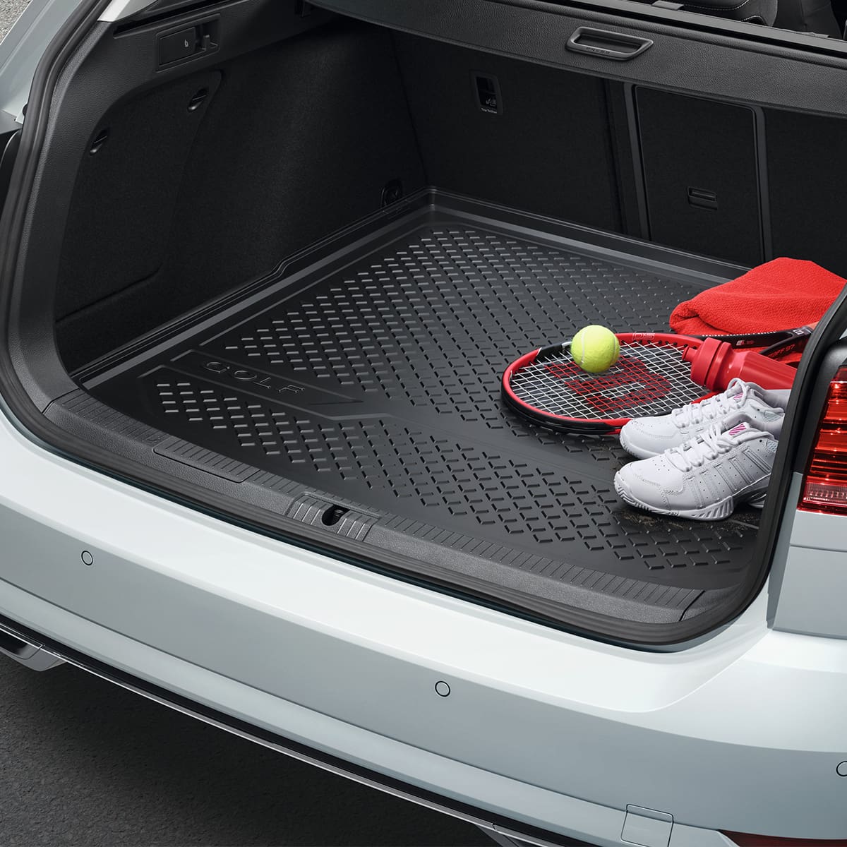 The practical and robust Volkswagen Genuine luggage compartment tray protects the luggage compartment from dirt and prevents the loads being transported from slipping. The plastic tray is washable and designed to fit perfectly in the vehicle. The surrounding raised rim of approx. 4 cm prevents liquids running out onto the vehicle floor. With Golf lettering.