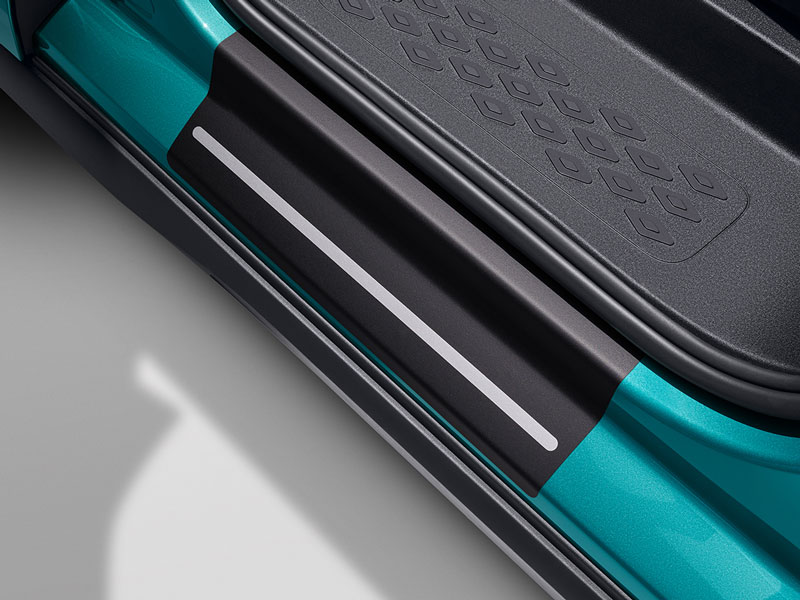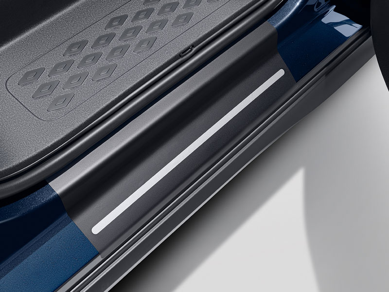 Volkswagen Genuine sill panel trim films. Black with silver decorative stripes. Front and rear, 4-piece. Visually enhances the vehicle. Protects against scratches around the door sill. Precisely cut. Easy to stick on.