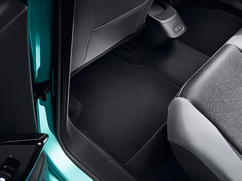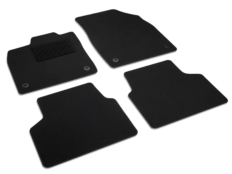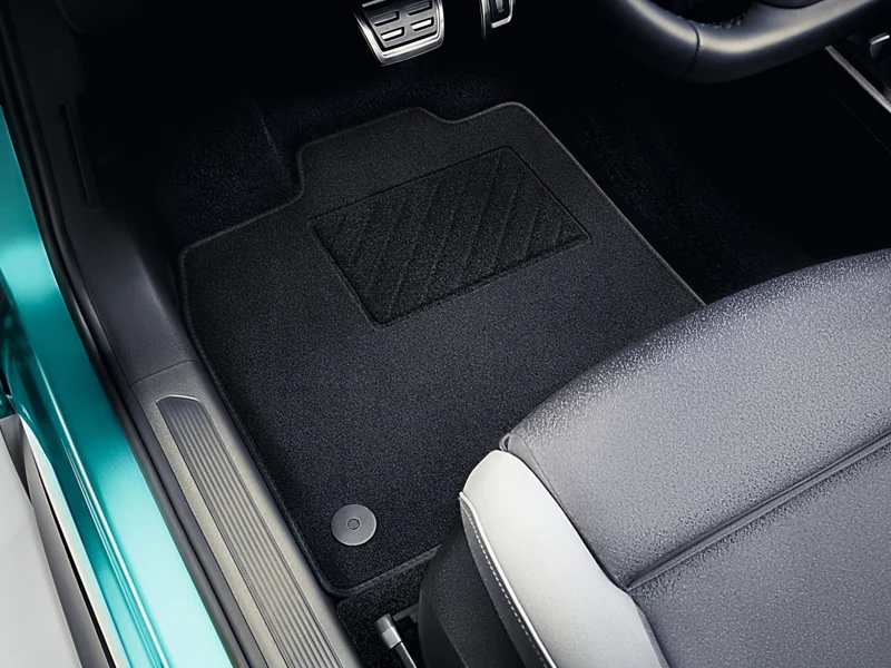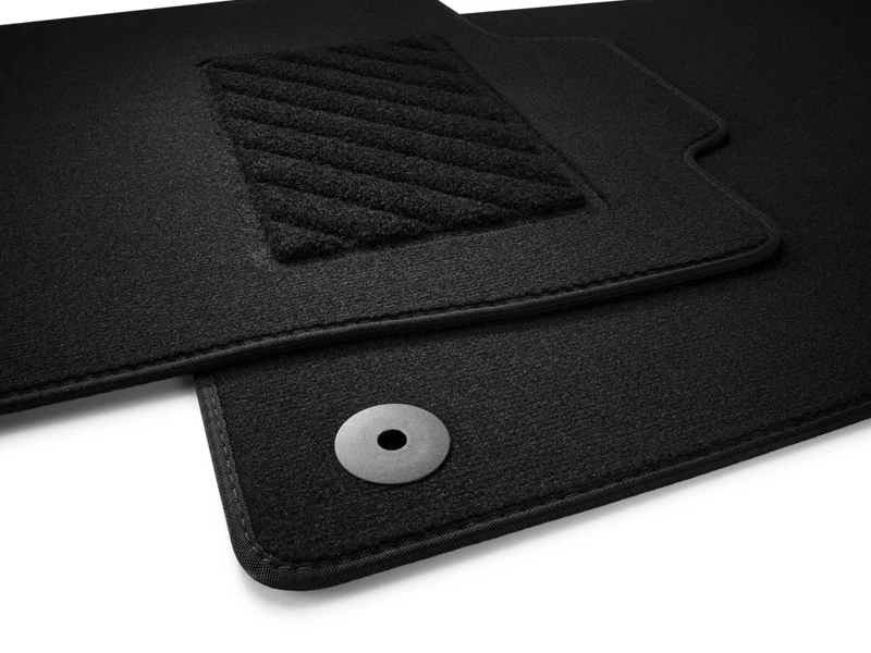 Quality velour, 480 g/m2. Made to measure. Textile binding and impact protection in the heel area. Non-slip rear coating. Suitable for the Volkswagen fastening system. Flame resistant