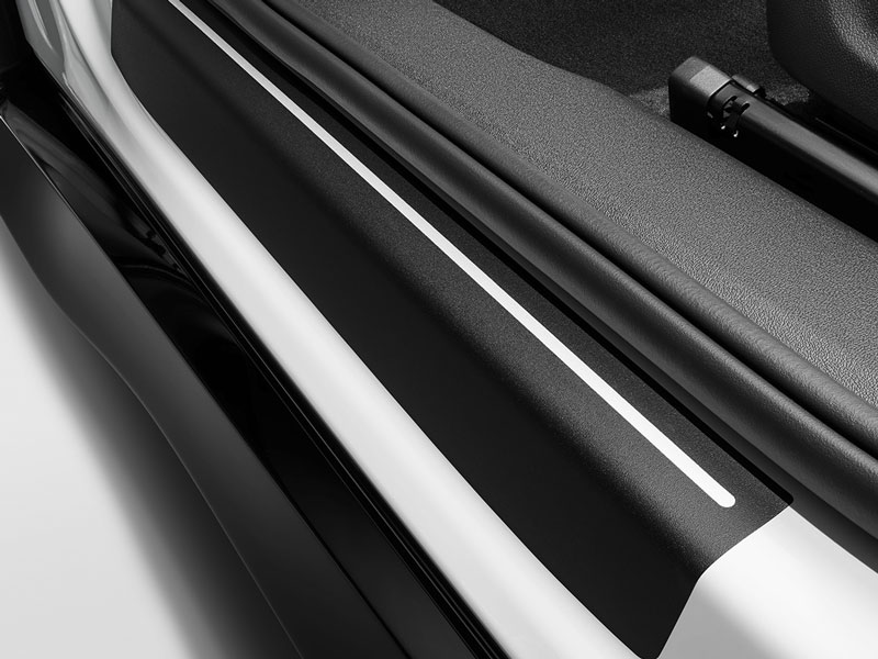 Volkswagen Genuine sill panel trim films. Black with silver decorative stripes. Front and rear, 4-piece. Visually enhances the vehicle. Protects against scratches around the door sill. Precisely cut. Easy to stick on.
