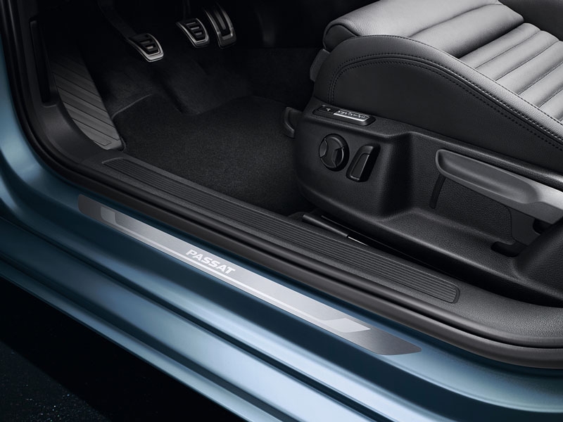 An eye-catcher when getting in: The high-quality aluminium sill protectors with Passat lettering protect the entrance areas and customise your vehicle’s appearance. One set consists of two perfectly fitting sill protectors for the front door sills which can be simply glued into place.