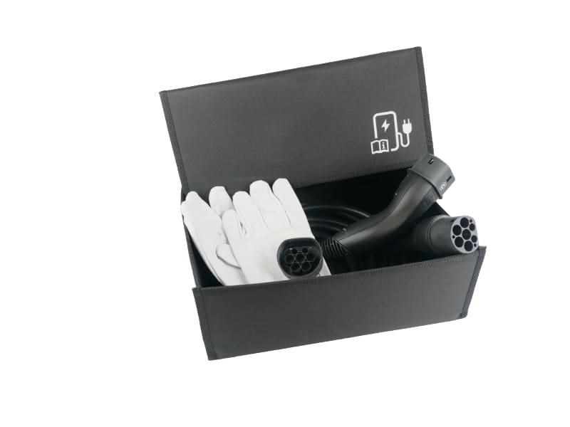 Folding box for electric charging cable. Dimensions LWH: 40 cm x 37 cm x 15 cm. Includes gloves and cleaning cloth in inner net. Velcro fasteners for attaching the cable(s). Logo on the lid Non-slip underside. Foldable. Designed for easy insertion/removal of the cable Cable does not lie “loose” in the luggage compartment. Colour: black with grey decorative border.