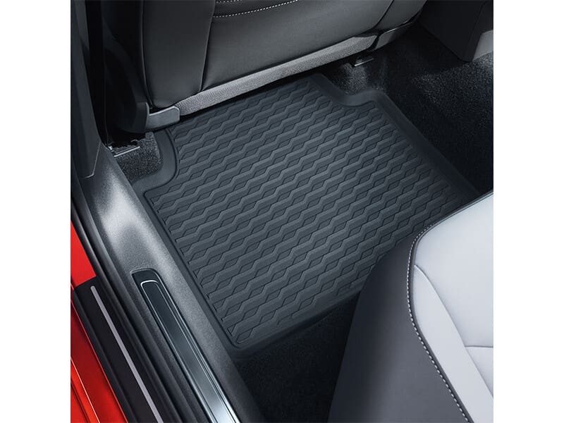 The Volkswagen Genuine all-weather mats protect your vehicle interior against dirt and moisture. They are designed to fit perfectly, are easy to clean and have a non-slip underside. The floor mats are also 100% recyclable, very sturdy and durable. The material used allows the Genuine all-weather floor mats to be considerably lighter and retain less odour than standard rubber floor mats. A set consists of two mats for the rear footwells.